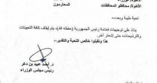 اقليم تهامة – عدن وجه رئيس الجمهورية عبدربه منصور هادي بإيقاف كافة التعيينات والترشيحات في الوزارات اليمنية والسلطات المحلية . وهذه صورة المذكرة المرفوعة من رئيس الوزراء الدكتور أحمد بن دغر إلى كافة نواب رئيس الوزراء ووزراء الحكومة الشرعية ومحافظي المحافظات بإيقاف كافة الترشيحات المرفوعة لإصدار قرارات بتعيينها. وأضاف …