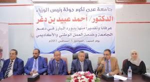 اقليم تهامة – متابعات … كرمت جامعة عدن اليوم رئيس الوزراء الدكتور أحمد عبيد بن دغر، بدرع و وسام الجامعة الذي سلمه له رئيس الجامعة الدكتور الخضر لصور ، تقديراً لدوره البارز في دعم الجامعة و خدمة العمل الوطني الأكاديمي في ظل الظروف العصيبة التي يمر بها اليمن.