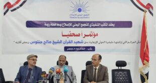 اقليم تهامة – مأرب – عبد الله العطار دعا مؤتمر صحفي، عقد الثلاثاء بمدينة مأرب، إلى إدانة دولية لجريمة اغتيال الشيخ صالح حنتوس، وإصابة زوجته واختطاف عدد من أفراد أسرته وأقاربه، مطالبا بمحاكمة عاجلة لمرتكبي الجريمة البشعة من عناصر مليشيا الحوثي الإرهابية. وفي المؤتمر الذي دعا إليه المكتب التنفيذي للتجمع …