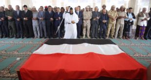 اقليم تهامة – متابعات … شيع الآلاف من المواطنين ظهر اليوم الجمعة جثمان اللواء أحمد سيف اليافعي إلى مقبرة ’’أبو حربة‘‘ بمدينة الشعب بعد الصلاة عليه بمسجد ’’الفردوس‘‘ بالشيخ عثمان وقبلها بمسجد المعاشيق بحضور الرئيس هادي ووزراء الحكومة اليمنية ومحافظ عدن وقيادات عسكرية وأمنية وعدد من ضباط التحالف العربي .