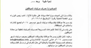 اقليم تهامة – خاص … اصدر محافظ محافظة الحديدة عبدالله أبو الغيث توجيهاً هاماً لجميع المكاتب التنفيذية بمحافظة الحديدة بسرعة ارسال كشوفات مرتبات موظفي الدولة بالمحافظة وفق كشوفات شهر ديسمبر من العام ٢٠١٤م. وحمل التوجيه الجهات المعنية المسؤولية القانونية والوطنية في حالة التأخر في إرسال الكشوفات المطلوبة وحرمان موظفي …