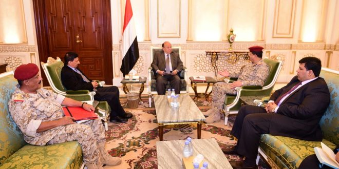 جاء ذلك خلال لقاء فخامته اليوم مع رئيس هيئة الاركان العامة اللواء ركن محمد علي المقدشي وقائد المنطقة العسكرية الرابعة اللواء ركن فضل حسن بحضور مدير مكتب القائد الاعلى اللواء ركن احمد العقيلي وذلك لمناقشة مستجدات الأوضاع الميدانية وسير العمليات العسكرية في مختلف الجبهات ومواقع التماس مع ميليشيا الحوثي وصالح الانقلابية