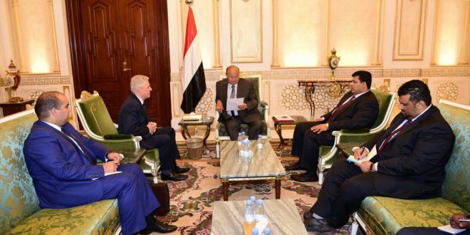 ومن جانبه اكد الرئيس هادي حرصه الدائم على تحقيق السلام المبني وفق رؤيه عملية وعلى الأسس والمرجعيات المتمثلة في المبادرة الخليجية ومخرجات الحوار الوطني والقرارات الأممية ذات الصلة وفي مقدمتها القرار 2216.