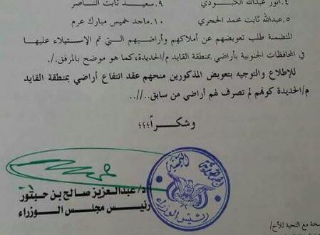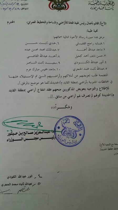 تداولت وسائل إعلام محلية، ومواقع التواصل الاجتماعي عددا من الوثائق، صادرة عن رئاسة حكومة الانقلاب توجه بصرف أراضي لعناصر انقلابية في مدينة #الحديدة.