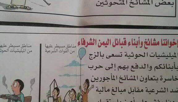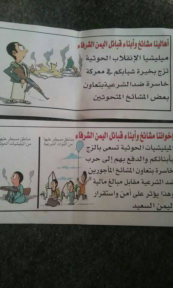 وجاء في المنشورات التي القتها طيران التحالف”اهالينا مشائخ وابناء قبائل اليمن الشرفاء..مليشيا الانقلاب الحوثية تزج بخيرة شبابكم في معركة خاسرة ضد الشرعية بتعاون بعض المشائخ المتحوثين ” كما جاء في المنشورات الورقية التي وصلت الى ايادي المواطنين ” مليشيا الانقلاب الحوثية تزج بخيرة ابناء اليمن في معركة خاسرة مع الشرعية بتعاون بعض المشائخ الماجورين مقابل مبالغ مالية وهذا يؤثر على استقرار اليمن السعيد”.