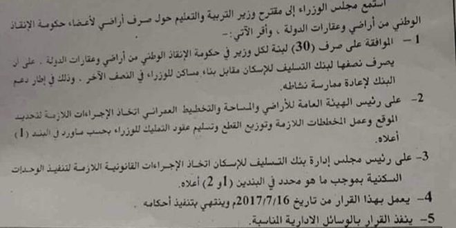 ووجه «مجلس الوزراء» بنك التسليف الزراعي (قطاع مختلط) ببناء مساكن للوزراء، «وذلك في إطار دعم البنك لإعادة ممارسة نشاطه».