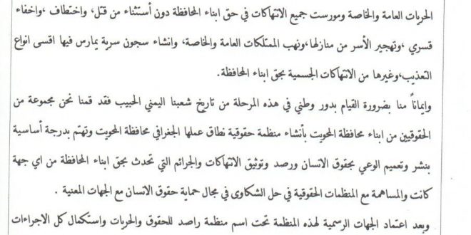 جا ذلك في بلاغ صحفي تقلينا نسخة منه حيث قام مجموعة من الحقوقيين من أبناء المحافظة بأنشاء منظمة حقوقية نطاق عملها الجغرافي محافظة المحويت وتهتم بدرجة أساسية في نشر وتعميم الوعي بحقوق الانسان ورصد وتوثيق الانتهاكات والجرائم التي تحدث بحق أبناء المحافظة من اي جهة كانت والمساهمة مع المنظمات الحقوقية في حل الشكاوى في مجال حماية حقوق الانسان مع الجهات المعنية …. إليكم نص البلاغ :-