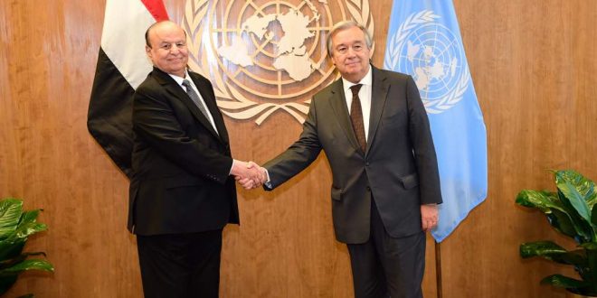 التقى الرئيس عبدربه منصور هادي رئيس الجمهورية، مساء اليوم في نيويورك، بالأمين العام للأمم المتحدة “أنطونيو غوتيريش ” بمكتب الأمين العام بالأمانة العامة للأمم المتحدة .