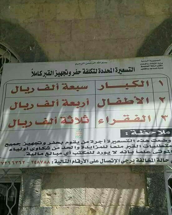 وبحسب الصورة، فقد حدد الحوثيون سعر القبر للكبار بمبلغ (7000) ريال والأطفال (4000) والفقراء (3000).