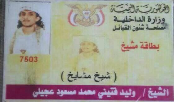 *صور لبطاقة اصدرتها مصلحة شؤون القبائل للمتحوث وليد فتيني محمد مسعود عجيلي من مديرية بيت الفقية (الزرانيق) عزلة المجاملة الطرف اليماني .