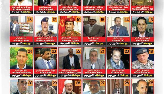 وضمت القائمة صالح الصماد رئيس ما يسمى بـ{المجلس السياسي} للانقلابيين، ومحمد علي الحوثي رئيس ما يسمى بـ{اللجنة الثورية} للميليشيات الحوثية المسلحة، وزكريا الشامي، وعبد الله يحيى أبو الحاكم، وعبد الخالق الحوثي، ومحمد العاطفي، ويوسف المداني، وعبد القادر الشامي، وعبد الرب جرفان، ويحيى الشامي حيث تم رصد 20 مليون دولار لمن يدلي بمعلومات تقود للقبض على أي منهم.