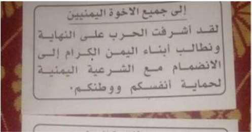 وقالت المنشورات ” أن الحرب أشرفت على النهاية ونطالب أبناء اليمن بالانضمام للشرعية لحماية الوطن ومستقبله .
