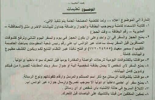 2-يمنع الحجز والسفر في ان واحد على ان يكون الحجز في يوم وترفع الكشوفات للمسافرين قبل السفر بست ساعات عبر الواتس اب على رقم شعبة المعلومات ومباحث العاصمة.