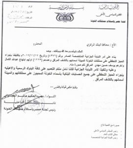 ووجهت وزارة الداخلية التي تسيطر عليها مليشيا الحوثي بوثيقة الى البنك المركزي، الخاضع لسيطرتها، قرارا تضمن، إجراء تحفظي على ممتلكات من وصفتهم بـ”الخونة”، وعددهم 1223أسم، اولهم ابتهاج عبد الله الكمال، والتي تعمل وزيرة للشؤون الاجتماعية في الحكومة الشرعية، وأخرهم يوسف حسين مهدي”.