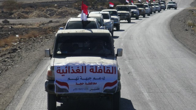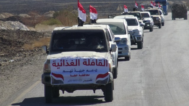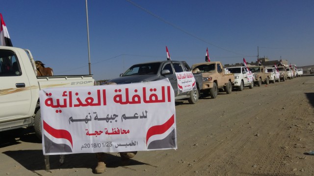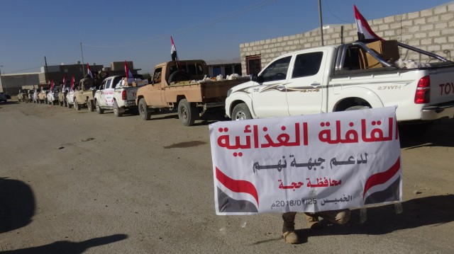 سيرت قيادة المقاومة الشعبية بمحافظة حجة صباح اليوم الخميس 26 /1/2018 قافلة غذائية لإخوانهم المرابطين من افراد الجيش الوطني والمقاومة الشعبية في المنطقة العسكريةالسابعة في جبهة نهم .