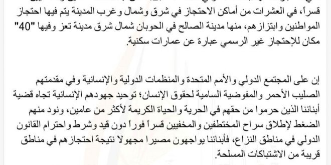 إن على المجتمع الدولي والأمم المتحدة والمنظمات الدولية والإنسانية وفي مقدمتهم الصليب الأحمر والمفوضية السامية لحقوق الإنسان؛ توحيد جهودهم الإنسانية تجاه قضية أبنائنا الذين حرموا من حقهم في الحرية والحياة الكريمة لأكثر من عامين، ونود منهم الضغط لإطلاق سراح المختطفين والمخفيين قسراً فوراً دون قيد وشرط واحترام القانون الدولي في مناطق النزاع، فأبنائنا يواجهون مصيرا مجهولا نتيجة احتجازهم في مناطق قريبة من الاشتباكات المسلحة.