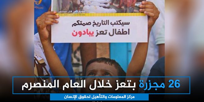 وأكد المركز في بيانه أن العام الماضي شهدت تعز 26 مجزرة بحق المدنيين من قبل مليشيات الحوثي عبر القصف المكثف بمختلف الأسلحة المتوسطة والثقيلة خلفت 52 قتيلا و96 جريحا.