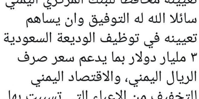 وقال ال جابر في تغريدة ” اهنئ معالي الدكتور محمد زمام على تعيينه محافظا للبنك المركزي اليمني سائلا الله له التوفيق وان يساهم تعيينه في توظيف الوديعة السعودية ٣ مليار دولار بما يدعم سعر صرف الريال اليمني، والاقتصاد اليمني للتخفيف من الاعباء التي تسببت بها ميليشيات الحوثيين الإيرانية على الانسان اليمني”.