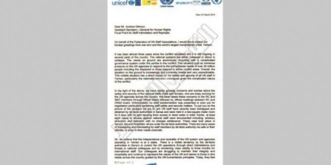 وقال موظفون تحدثوا مع «الشرق الأوسط» شريطة عدم ذكر أسمائهم حماية لهم من الاستهداف، إن موظفي الأمم المتحدة بعثوا برسالتين؛ الأولى في سبتمبر (أيلول) الماضي، والثانية في 5 مارس (آذار) الحالي، ونشرت «الشرق الأوسط» جزءاً من تفاصيلها أول من أمس.