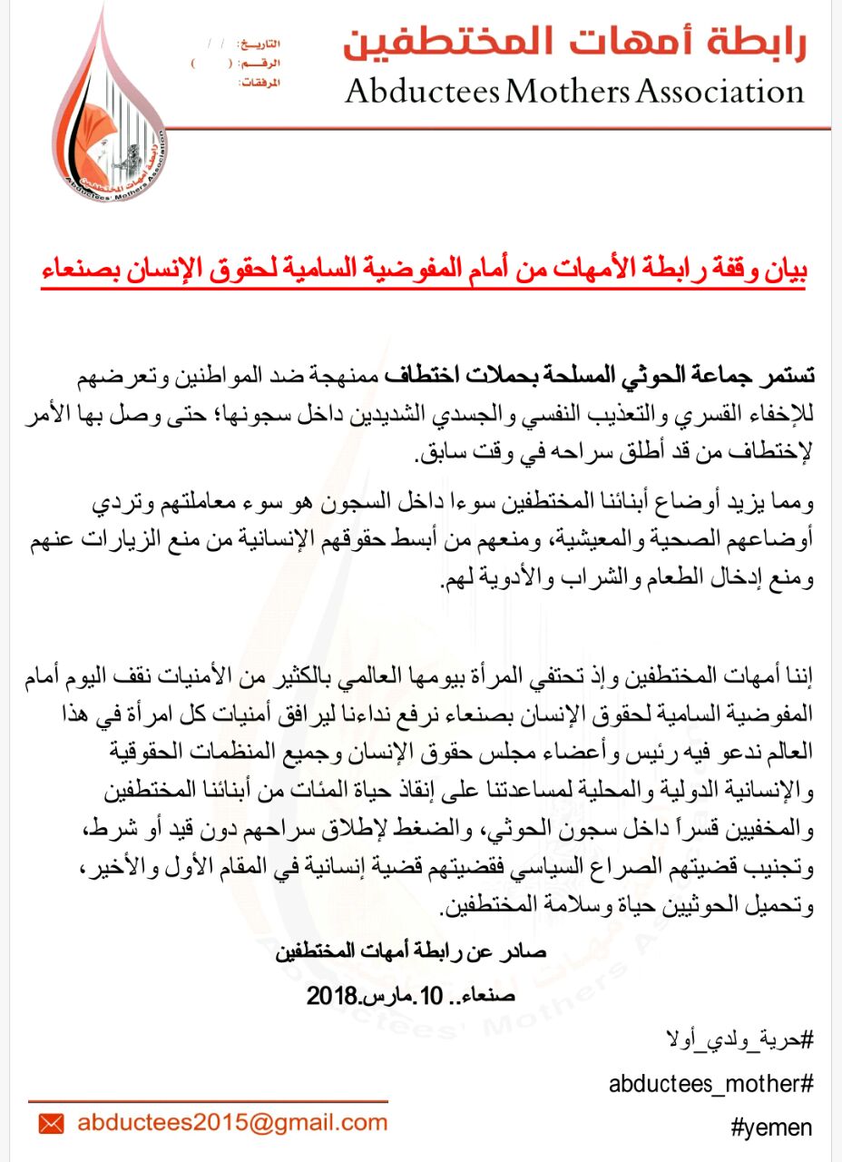 إننا أمهات المختطفين وإذ تحتفي المرأة بيومها العالمي بالكثير من الأمنيات نقف اليوم أمام المفوضية السامية لحقوق الإنسان بصنعاء نرفع نداءنا ليرافق أمنيات كل امرأة في هذا العالم ندعو فيه رئيس وأعضاء مجلس حقوق الإنسان وجميع المنظمات الحقوقية والإنسانية الدولية والمحلية لمساعدتنا على إنقاذ حياة المئات من أبنائنا المختطفين والمخفيين قسراً داخل سجون الحوثي، والضغط لإطلاق سراحهم دون قيد أو شرط، وتجنيب قضيتهم الصراع السياسي فقضيتهم قضية إنسانية في المقام الأول والأخير، وتحميل الحوثيين حياة وسلامة المختطفين.