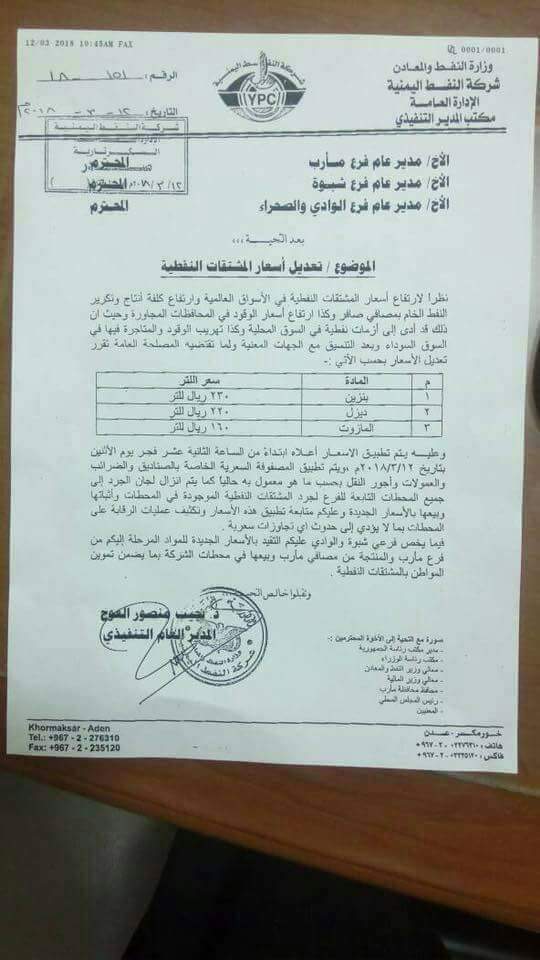 وأقرت شركة النفط اليمنية بحسب وثيقة بعثها المدير العام التنفيدي للشركة الدكتور نجيب منصور العوج لفروع الشركة في مأرب وشبوة والوداي الصحراء التعدليل في أسعار المشتقات النفطية كالتالي :
