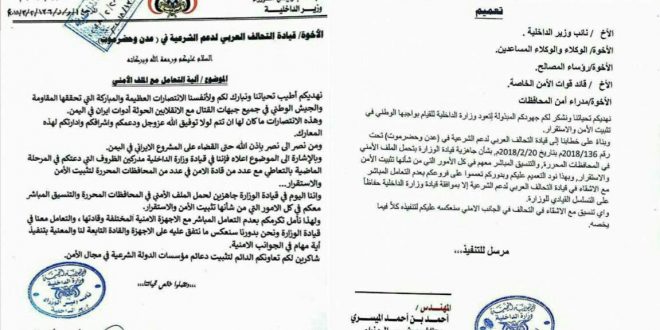 في خطوة تحمل إشارة إلى بدء مرحلة جديدة من العلاقة بين الحكومة الشرعية والتحالف العربي وجه نائب رئيس الوزراء اليمني وزير الداخلية أحمد الميسري مذكرتين الأولى لقيادة التحالف والثانية عبارة عن تعميم للمسؤولين الأمنيين، وكلا المذكرتين تؤكد على أمر واحد وهو تحديد قيادة وزارة الداخلية كنافذة وحيدة للتعامل مع التحالف العربي فيما يتعلق بترتيب الأوضاع الأمنية.