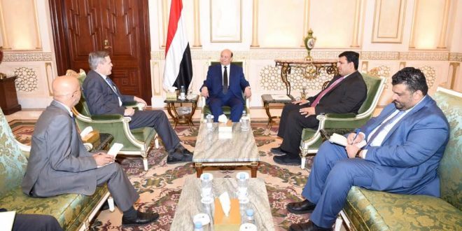 و أشاد فخامة الرئيس بجهود السفير الأمريكي الحميدة التي تسعى إلى تحقيق السلام المستدام انطلاقاً من موقف بلاده الداعم لليمن وشرعيته الدستورية .. مجدداً التأكيد على دعم الحكومة الشرعية لهذه الجهود التي تهدف إلى تحقيق السلام الدائم والقائم على المرجعيات الثلاث المتمثلة بالمبادرة الخليجية وآليتها التنفيذية ومخرجات الحوار الوطني الشامل والقرارات الدولية ذات الصلة وعلى رأسها القرار رقم 2216 .