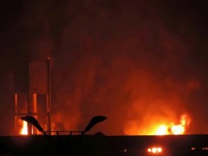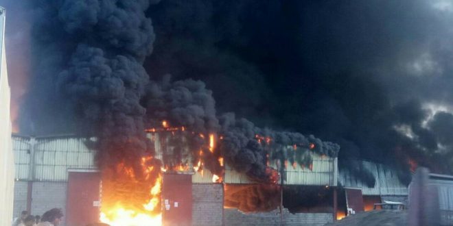 كما اندلع حريق هائل منذ قليل في أربعة هناجر تابعة لمنظمة الغذاء العالمي التابع للأمم المتحدة ، بالقرب من شركة الغراسي مدينة الحديدة ، ولا تزال مخازن الغذاء تحترق منذ ساعتين .