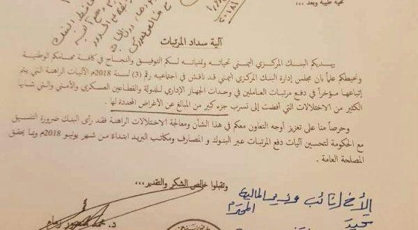 وطالب البنك المركزي الحكومة إلى التعاون معه ومعالجة الاختلالات لتحسين آليات دفع المرتبات عبر البنوك والمصارف ومكاتب البريد ابتداء من شهر يونيو 2018.