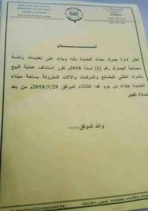 وفي سابقة خطيرة، أعلنت جمارك ميناء الحديدة ، عطفاً على توجيهات رئيس مصلحة الجمارك، ببيع البضائع والمركبات والآلات المتروكة في الميناء بالمزاد العلني.