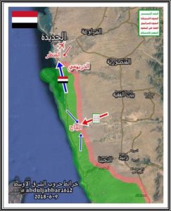 وأوضحت الخريطة سير الجبهتان ملتهبتان الاولى شمالا المقاومه المشتركه المدعومه من التحالف العربي تسيطر على مناطق شمال الطائف وتقترب من مشارف قرية المنظر ، وفي الجنوب مليشيات الحوثي تشن هجمات على منطقة الجاح لاعاقة التقدم الى الحديدة ، إلا أن الهجوم انتهى على الجاح بهزيمة ساحقة للمليشيا وتم تأمين جميع المناطق والسيطرة على مزارع كثيرة.