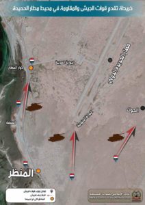 وأصبح مطار الحديدة الاستراتيجي تحت السيطرة النارية لقوات الجيش والمقاومة ، بينما حوصرت عناصر ميليشيات الحوثي الإيرانية داخل أسوار المطار ويجري الان التعامل معها .