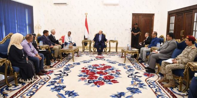 استقبل فخامة الرئيس عبدربه منصور هادي رئيس الجمهورية،اليوم،ومعه رئيس الوزراء الدكتور احمد عبيد بن دغر ونائب رئيس الوزراء وزير الداخلية المهندس احمد الميسري ،بعثة الأمم المتحدة المكونة من مساعد الأمين العام للشئون الأمنية لمكتب الأمم المتحدة بيتر درينين ومساعدة مساعد الأمين العام للشئون الأمنية ،ماشاء جيفري ،ورئيس اللجنة الأمنية لمكتب الأمن والسلامة التابع للأمم المتحدة جوهاس كيكوب وعدد من المختصين في مكتب الأمن والسلامة التابع للأمم المتحدة.