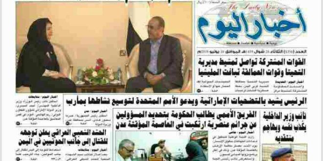 وكتب المحرر السياسي في مقالته “أخبار اليوم” والعود أحمد إن الصحيفة تعود من أرض الحضارة والتاريخ بحلة جديدة يا من أحرقتم مؤسسة الشموع وأخبار اليوم في عدن ونهبتموها في صنعاء”.