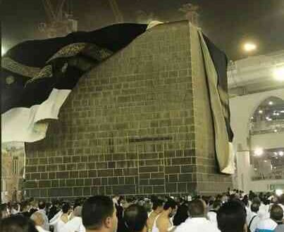 لأول مرة.. شاهد ملايين المسلمين في بقاع المعمورة حجارة وبناء الكعبة المشرفة بعد أن هبت رياح شديدة مساء (الأحد) وكشفت ثوب الكعبة المشرفة ما استوقف الكثير من المصلين والزوار أمام المشهد النادر، وكان الفريق المعني بوضع ثوب الكعبة المشرفة الجديد شرع في تحرير أركان الكسوة من المذهبات ظهر الثامن من شهر ذي الحجة، حسب الخطة التشغيلية والفنية لتبديل الثوب القديم بالجديد، إذ كانت المذهبات عبارة عن ستارة باب الكعبة المشرفة المصنوعة من الذهب الخالص بالجهة الشرقية، 4 صمديات تتضمن سورة الإخلاص والموجودة في الأركان الأربعة و4 قناديل (الله أكبر) مثبتة عند خطة النية. ويتم استخدام رافعة للوصول إلى سطح الكعبة المشرفة و(سقالات).