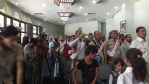 وفي نهاية الفعالية وقف المختطفين المفرج عنهم، وقفة تضامنية مع بقية رفاقهم الذين مازلوا خلف القضبان، وأطلق المختطف المحرر عبد الجبار الرقيمي حمامة الحرية.