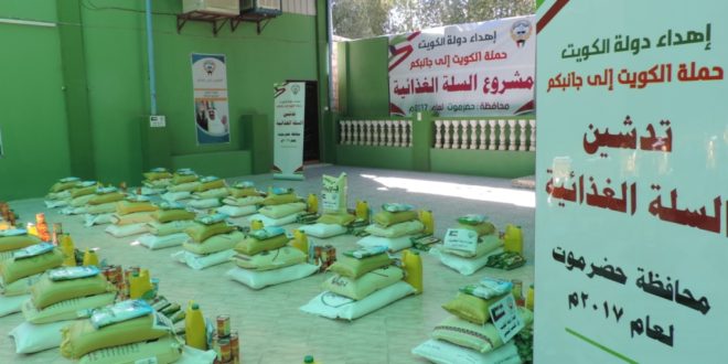 دشن اليوم بمدينة سيئون محافظة حضرموت توزيع 4 ألف و 900 سلة غذائية ضمن حملة “الكويت إلى جانبكم” .