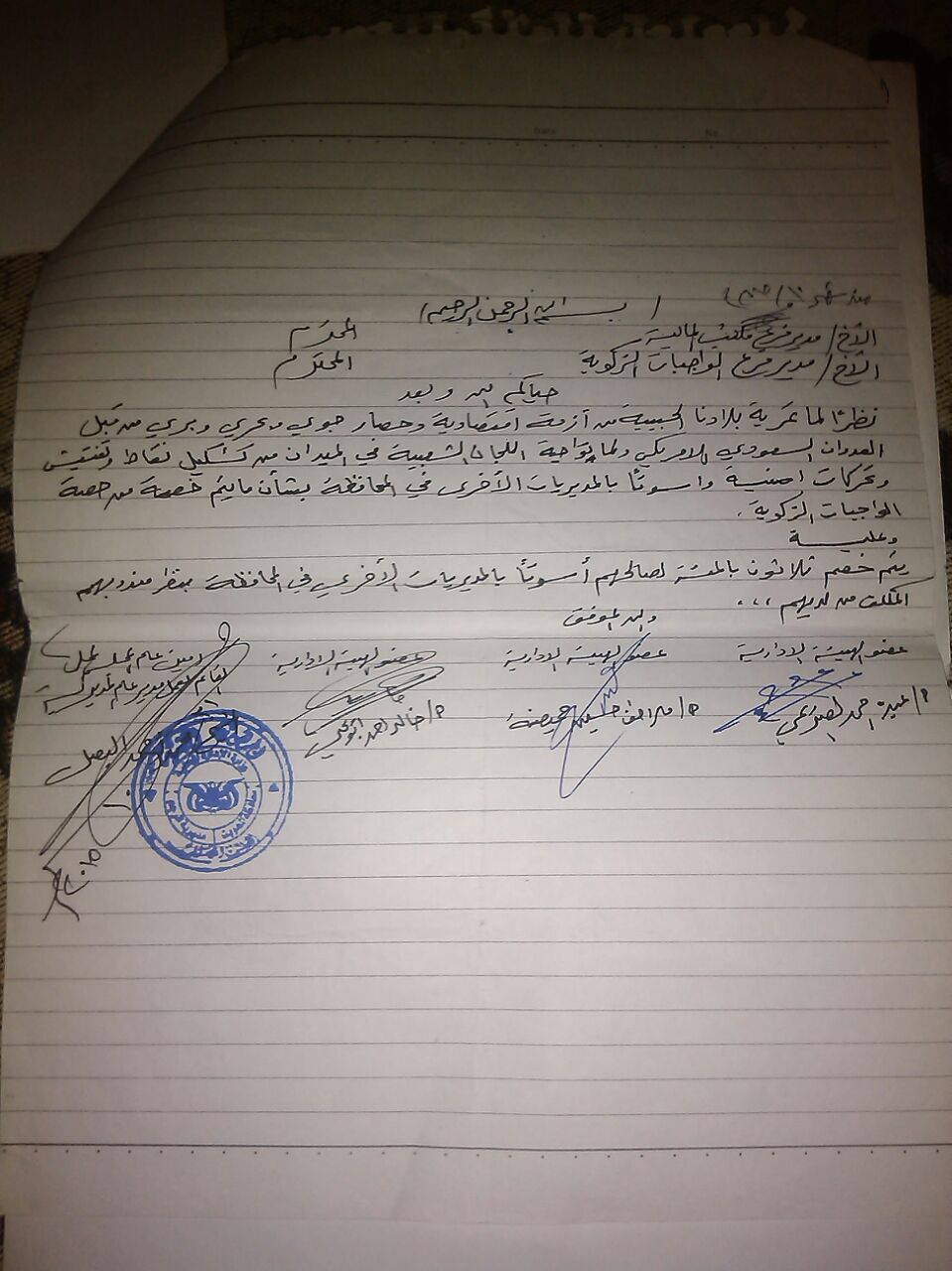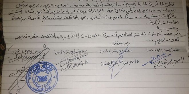 وتنص المذكرة…إنه نظراً لما تقوم به “اللجان الشعبية” في الميدان من تشكيل نقاط وتفتيش وتحركات امنية واسوتا بالمديريات الآخرى في المحافظة بشأن ما يتم خصمه من حصة الواجبات الزكوية