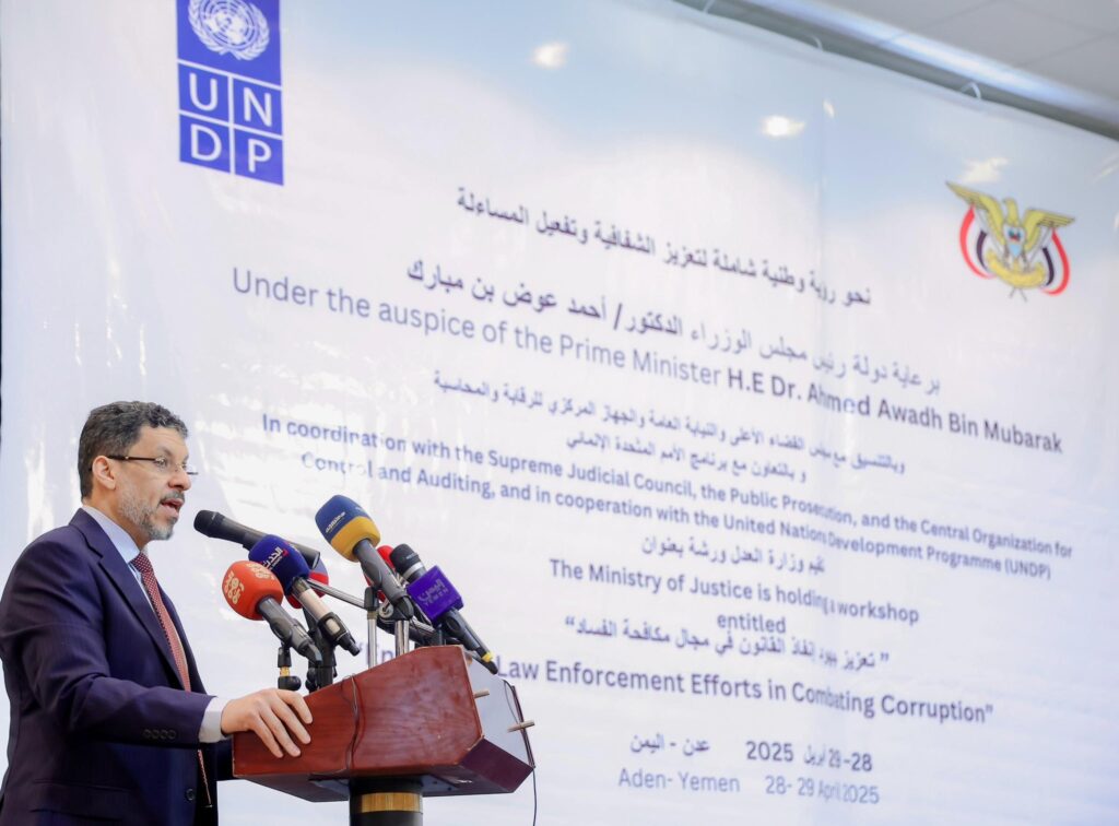 افتتح رئيس مجلس الوزراء الدكتور أحمد عوض بن مبارك اليوم في عدن ورشة عمل حول تعزيز جهود إنفاذ القانون في مكافحة الفساد، وذلك في إطار بناء رؤية وطنية شاملة للشفافية والمساءلة. الورشة، التي تعد الأولى من نوعها في اليمن، تجمع قضاة، النيابة العامة، الأجهزة الرقابية، المجتمع المدني، والإعلام لمناقشة سبل مكافحة الفساد وتعزيز النزاهة.