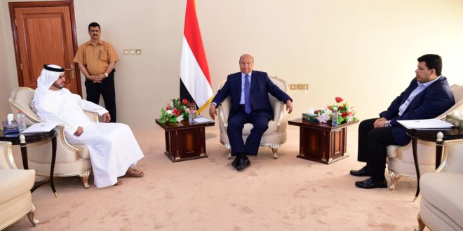 وفي اللقاء عبر فخامة الرئيس عن امتنانه وتقديره لمجمل الدور والجهود التي تقوم بها الاماراتً لدعم اليمن في اطار موقفهاً الداعم والبارز ضمن التحالف العربي الدي تقوده المملكة العربية السعودية.