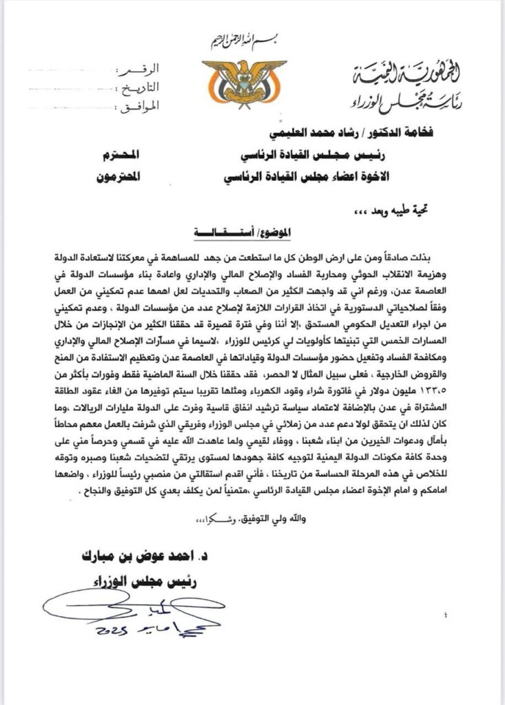 في خطوة مفصلية وغير متوقعة، قدّم رئيس مجلس الوزراء اليمني الدكتور أحمد عوض بن مبارك استقالته الرسمية من منصبه، موجّهًا خطابًا صريحًا وقويًا إلى رئيس مجلس القيادة الرئاسي الدكتور رشاد العليمي وأعضاء المجلس، كاشفًا فيه عن أسباب عميقة ومؤلمة دفعته لاتخاذ هذا القرار.