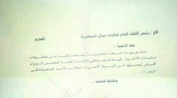 وجاءت الوثيقة التي رفعها ” ذيبان ” إلى رئيس اتحاد نقابات عمال اليمن ليوصلها إلى ما أسماه ” الوسيط الأممي ” .
