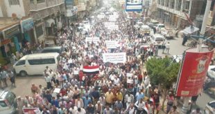 اقليم تهامة – تعز خرجت مسيرة حاشدة قبل قليل وفاء للشهداء والجرحى البواسل تطالب باستعادة مؤسسات الدولة وانهاء الانقلاب وبناء اليمن الاتحادي بقيادة الرئيس هادي إليكم نص البيان للشباب الثورة : –