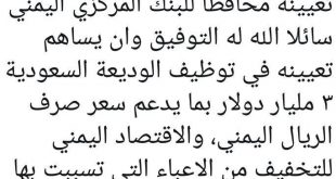 اقليم تهامة – متابعات أصدر السفير السعودي لدى اليمن، محمد آل جابر، أول تعليق رسمي على القرار الذي أصدره الرئيس عبدربه منصور هادي وتضمن تعيين محمد منصور زمام، محافظاً للبنك المركزي اليمني.